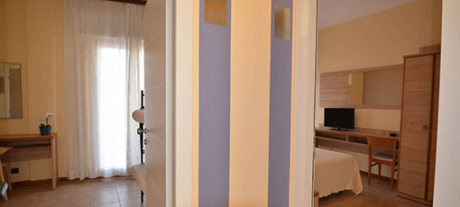 Le nostre camere godono di vista mare laterale; i bagni, interamente rinnovati in stile moderno e dotati di box doccia, asciugacapelli, set di cortesia.